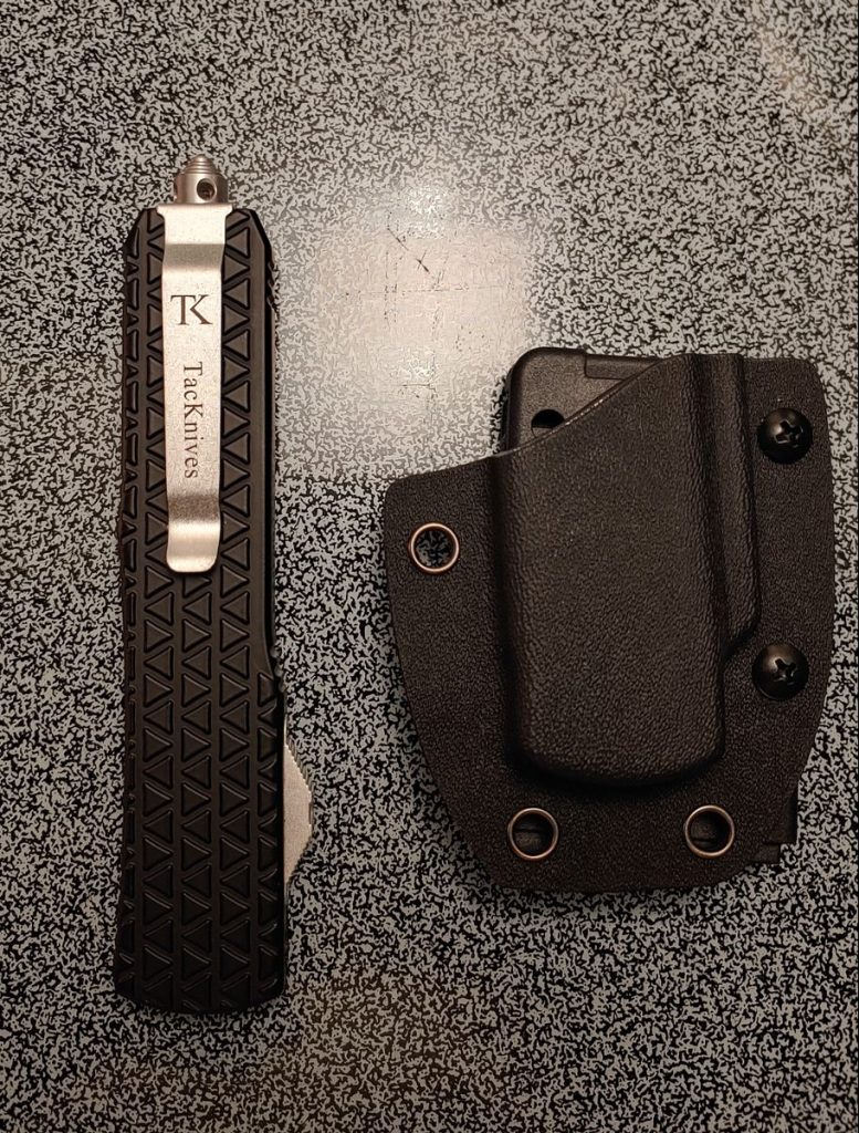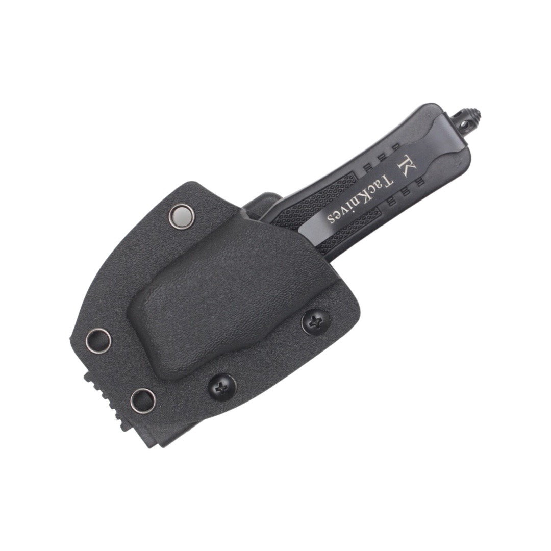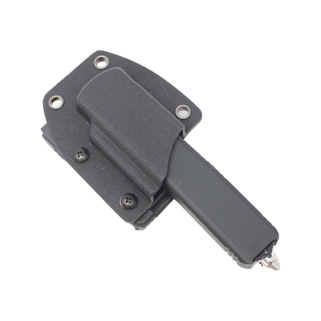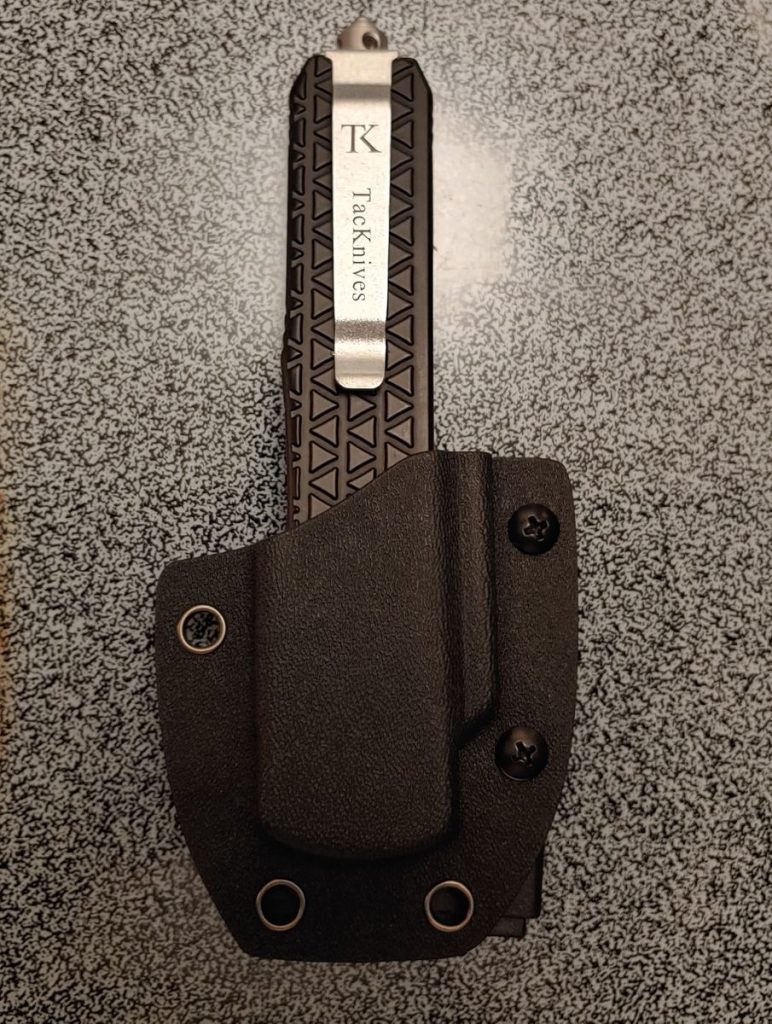 True Kydex, not just another look-a-like. I appreciate the easy to open belt attachment shown in pic as well as being able to adjust it to the widths of any of different belts. I never thought about getting a kydex knife holder for an OTF knife so when I saw it advertised next to the knives I thought, “why not, it might save my pocket for other things while allowing 100% concealment? The knife in pic is 8-9 inches when opened so when the blade is retracted it’s like having a Bowie or other fixed blade without having it print under a tee shirt. The knife locks securely into place too. It won’t fall out if I fall to the ground or bump into something. Pics include the knife I bought from Tacknives (MT2DP). Make sure you order the right size for your knife. The attachment should have the same size number shown in knife model.