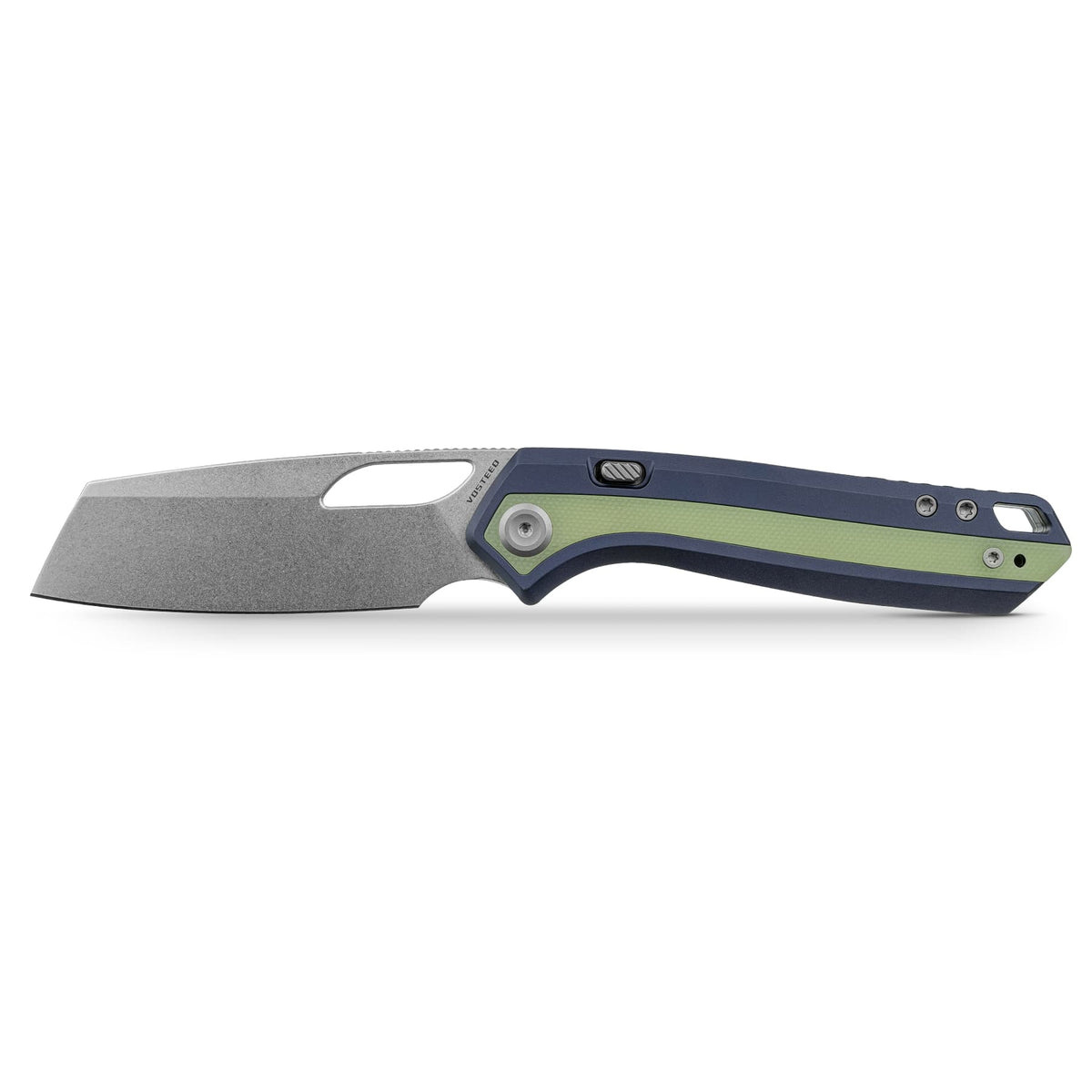 The Vosteed Kroc 329 in Stonewash/Dark Slate Blue with Glow-in-the-Dark G10 is for those who want their knife to stand out day and night. The 3.29″ S35VN sheepsfoot blade carries a textured stonewash finish at HRC 60±1 that hides scratches while delivering serious performance.