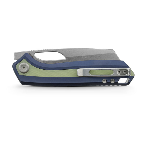 Dark Slate Blue aluminum pairs with a Glow-in-the-Dark (GID) G10 inlay that charges with ambient light and glows green in the dark — perfect for low-light carry. Dual deployment via front flipper or thumb hole, Top Liner Lock, and a reversible clip make this the most fun and functional Kroc 329 variant. 7.72″ overall, 4.02 oz.