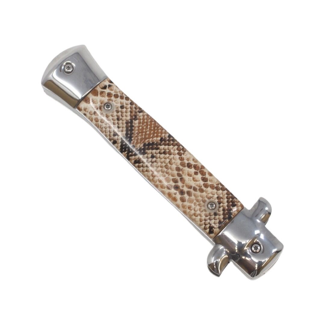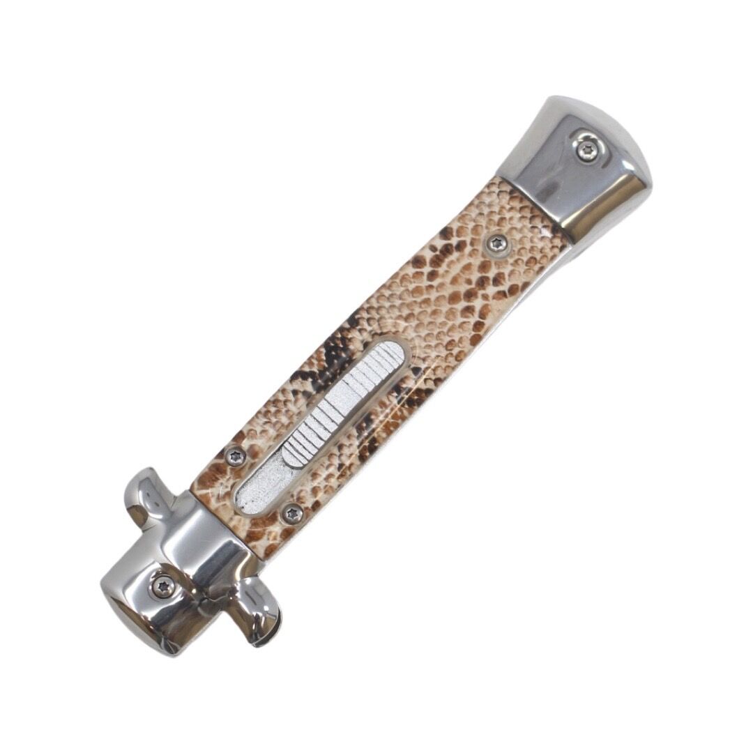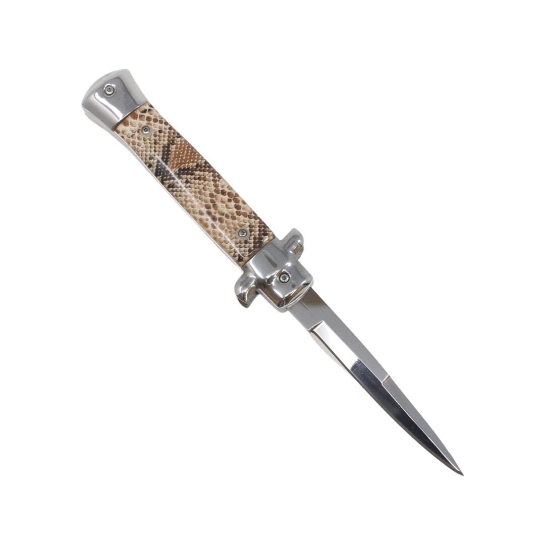 The TacKnives Italian Stiletto OTF series STMYS1 is a one of a kind switchblade and OTF all in one! The STMYS1 mimics the popular and iconic Italian Stiletto looks. The blade shoots out at the switch of a bottom and will retract in the same manner.