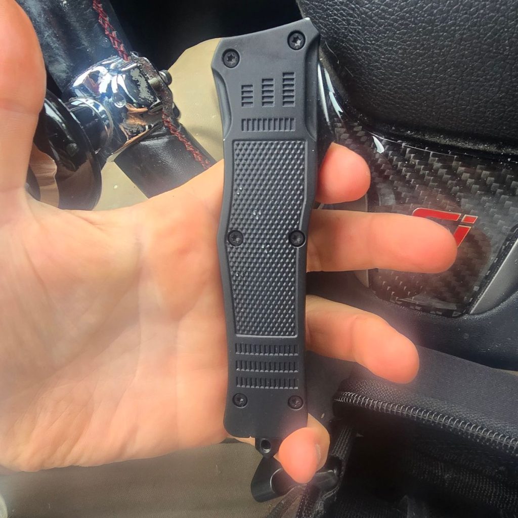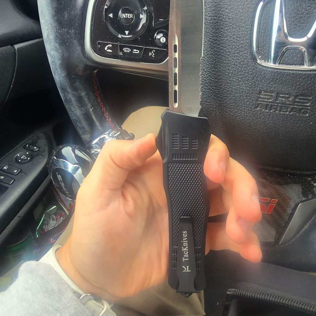 TacKnives MLT7 series OTF is a large OTF knife. The MLT7 series OTF knife features different blade styles with a grippy rubberized handle. The handle is machined for improved grip and ergonomic style. It also includes a stainless steel pocket clip for tip-down carry and a ballistic window breaker at the end.