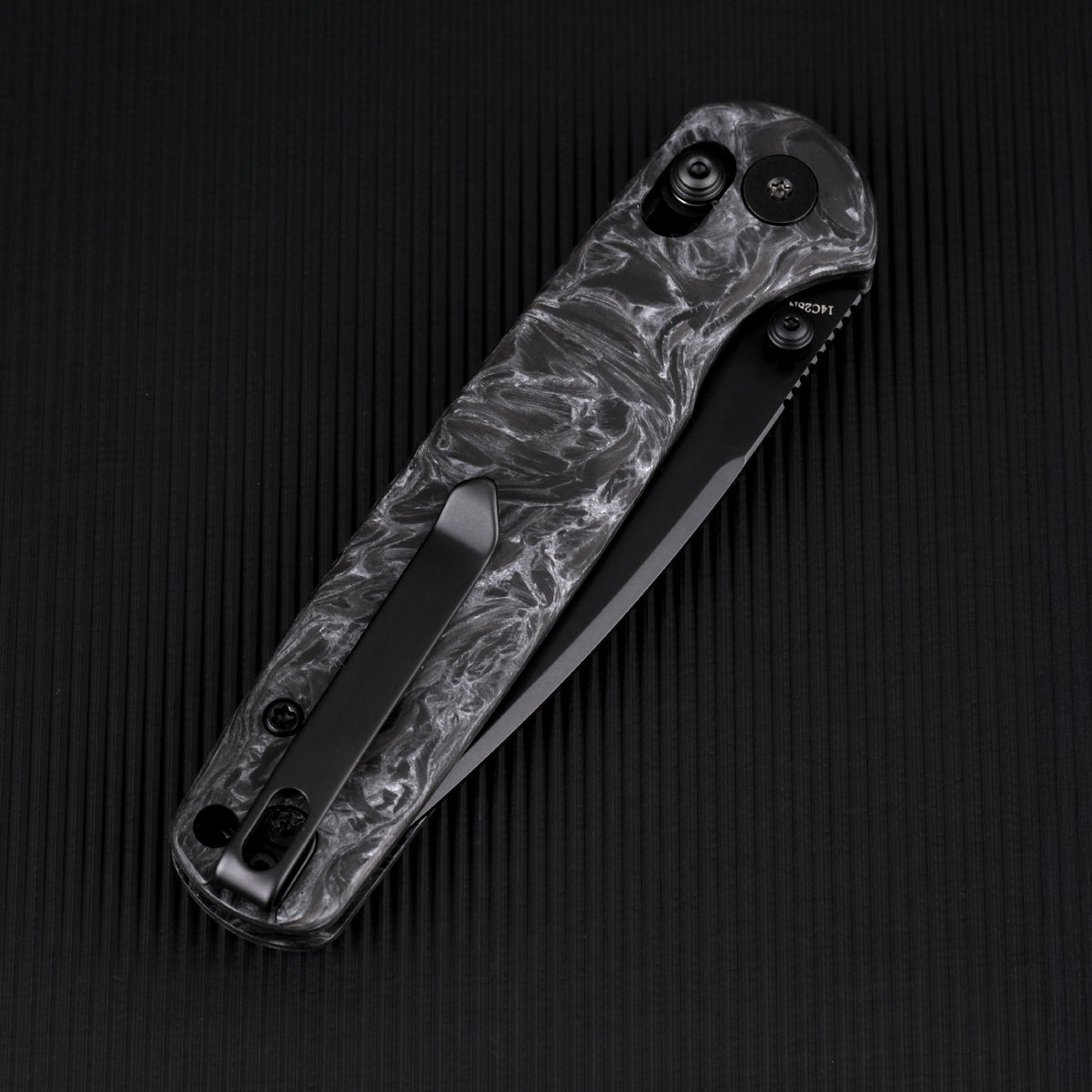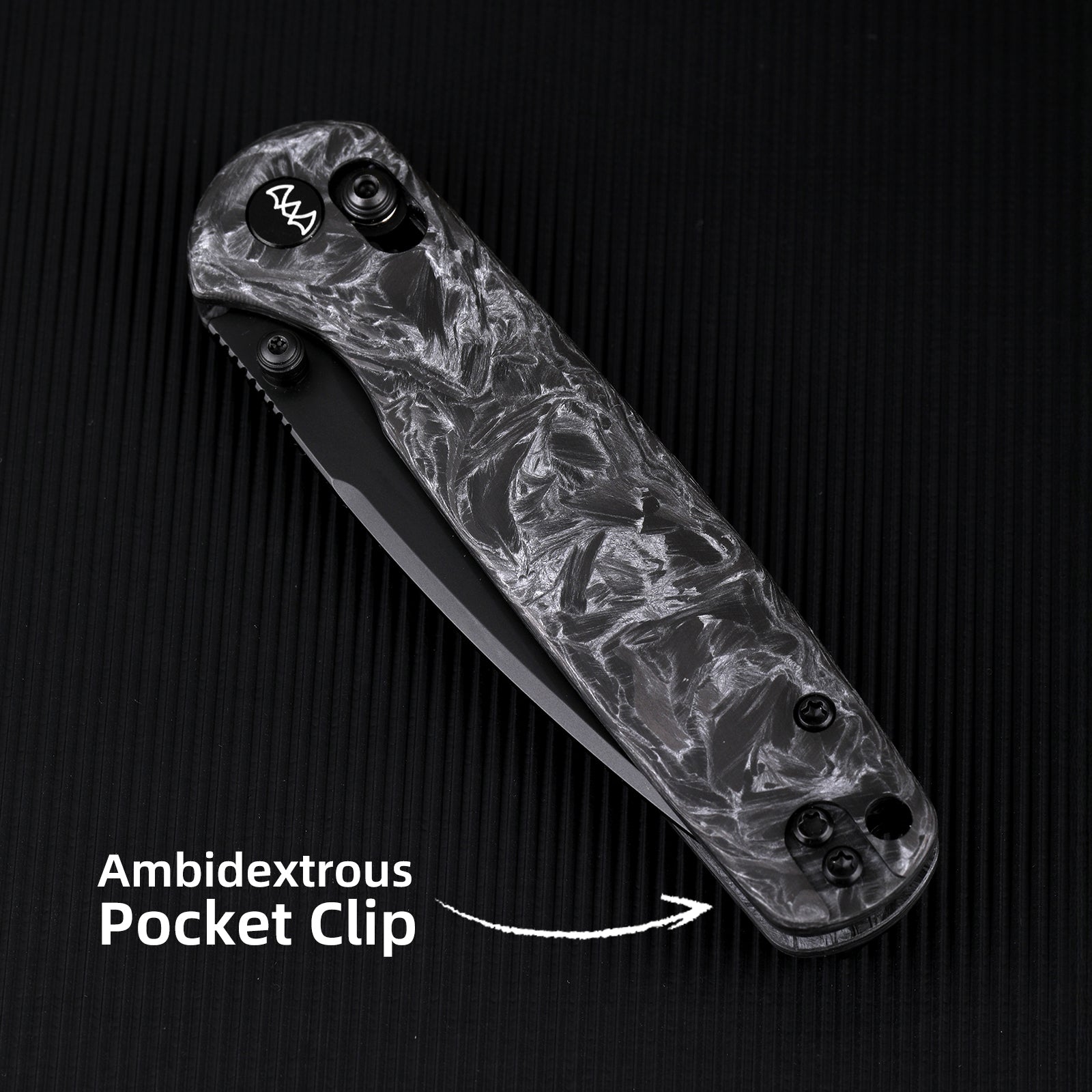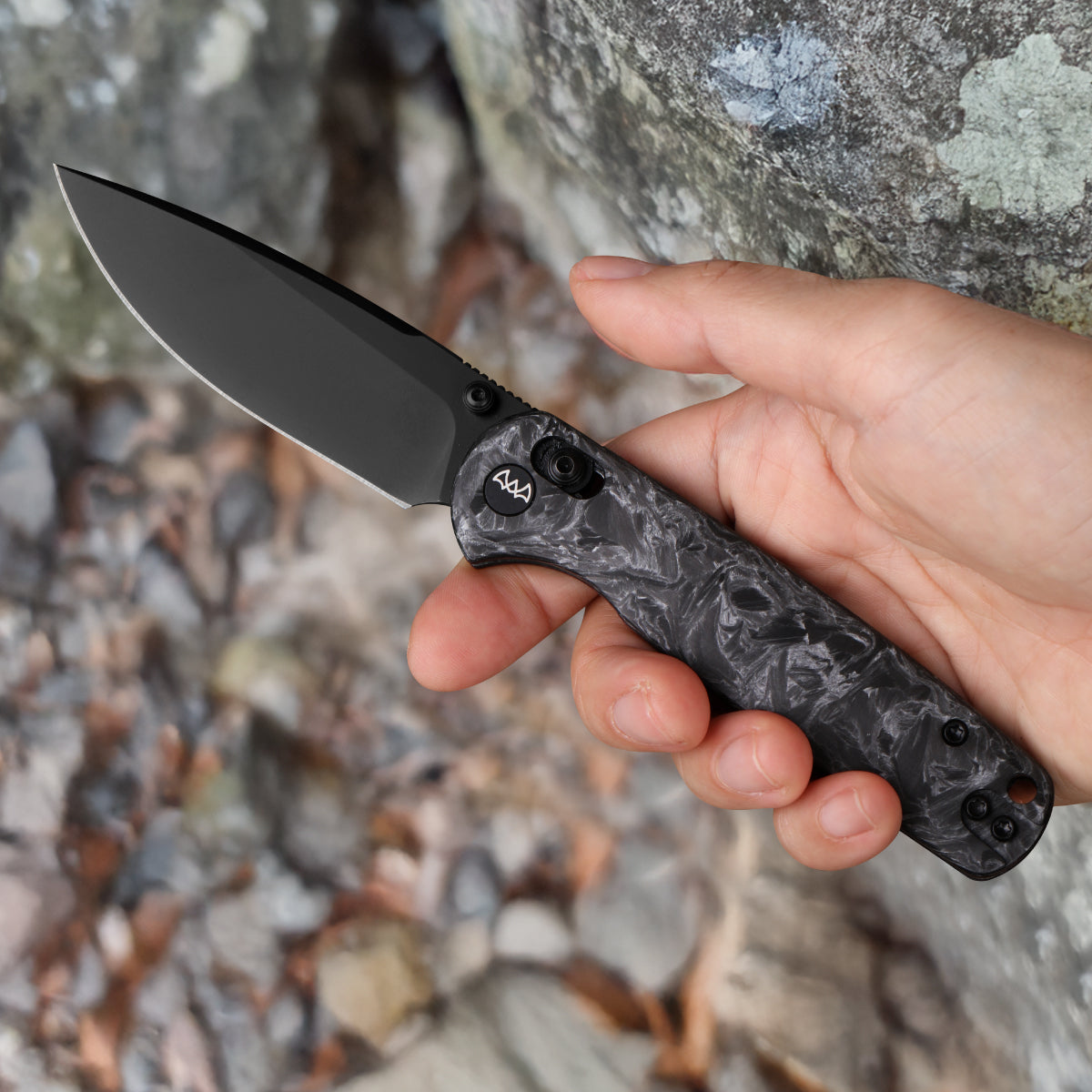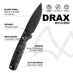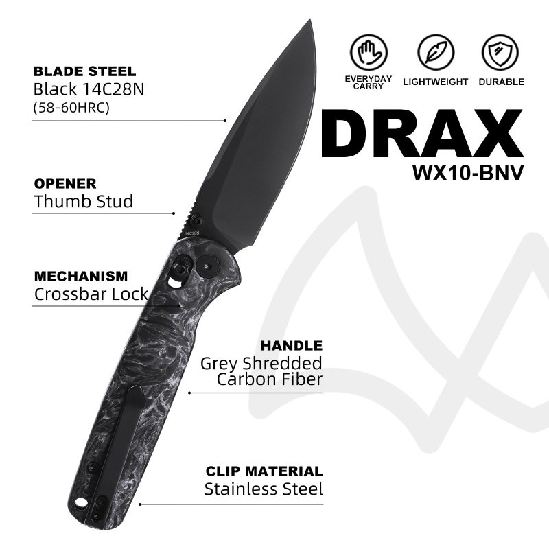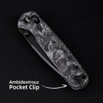 The Wixco Drax II is a classic and minimalist everyday carry folding knife featuring a 3.23″ 14C28N blade with a black finish. Built with a grey shredded carbon fiber handle and crossbar lock mechanism with thumb stud deployment. Reversible deep carry clip for versatile carry options.
