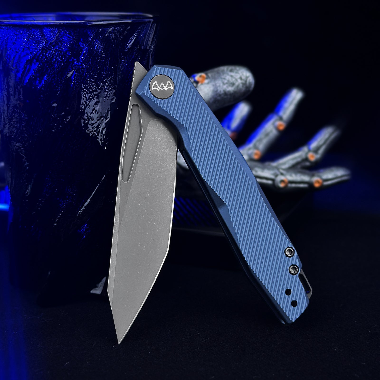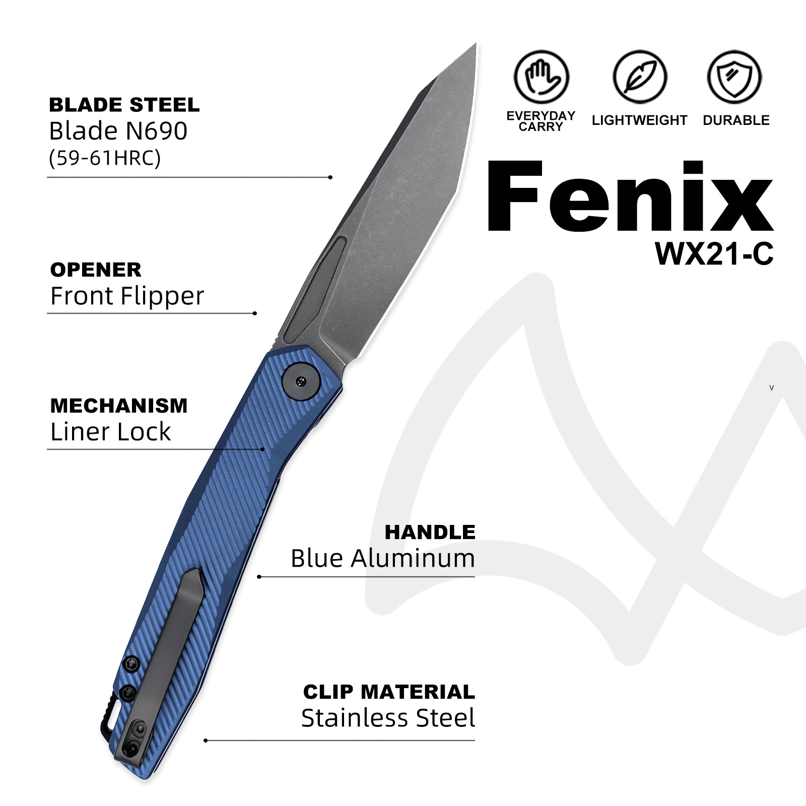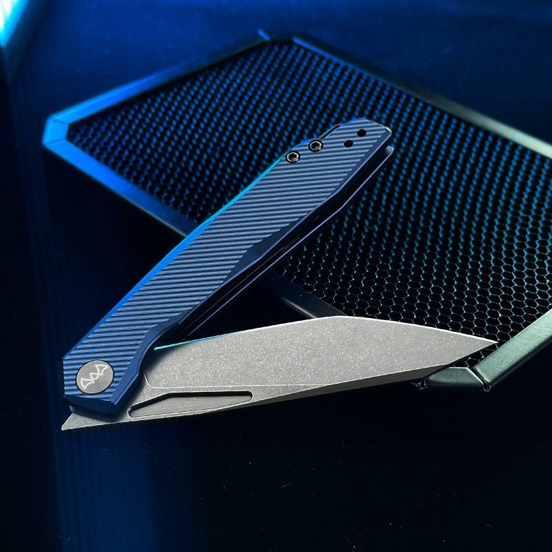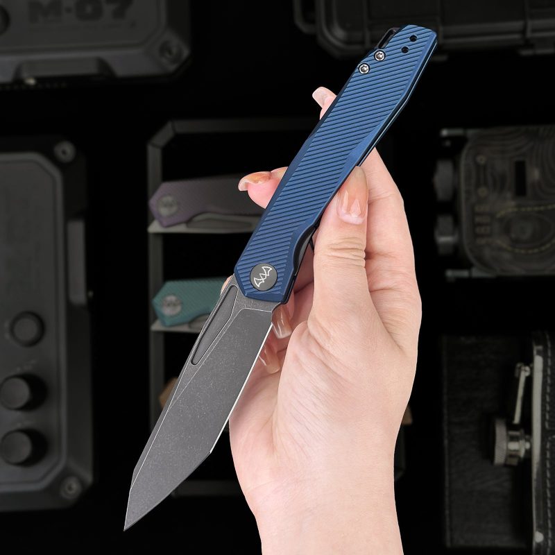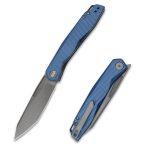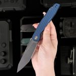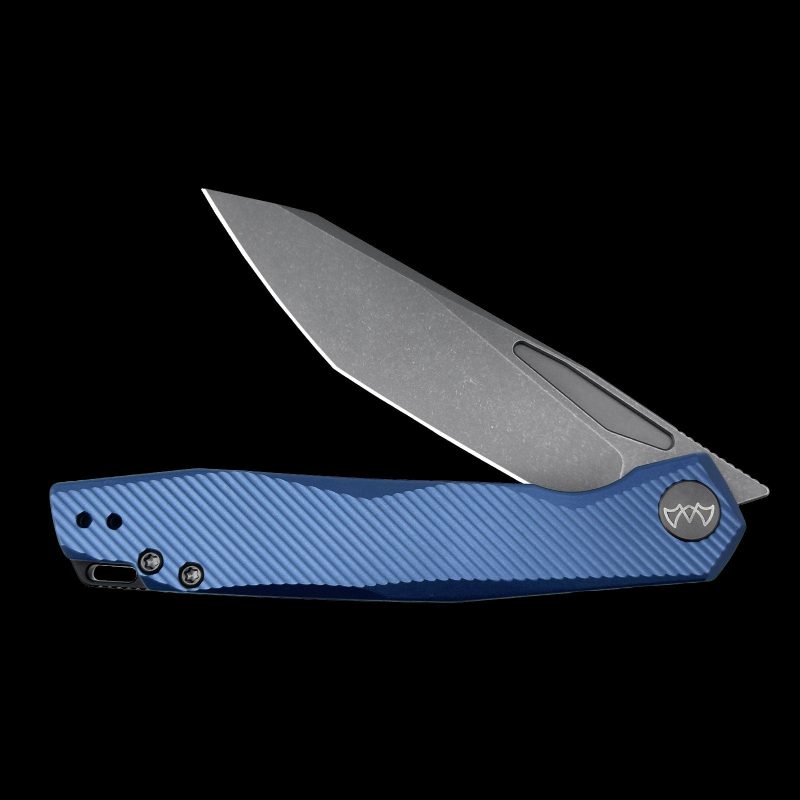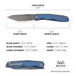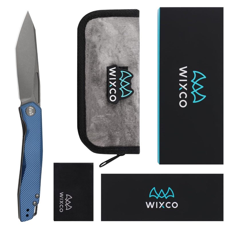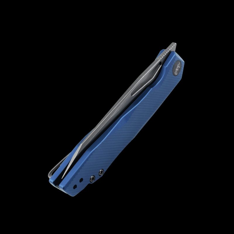 The Wixco Fenix is a sleek everyday carry folding knife featuring a 3.74″ N690 blade with a grey stonewash finish. Built with an aluminum handle in navy blue, it uses a liner lock mechanism with front flipper deployment. Designed for EDC, outdoor use, and tactical tasks.