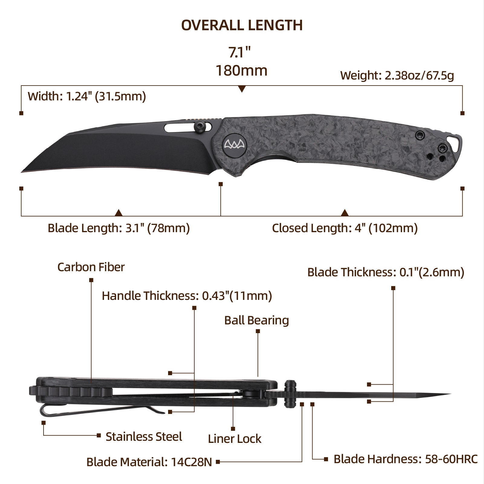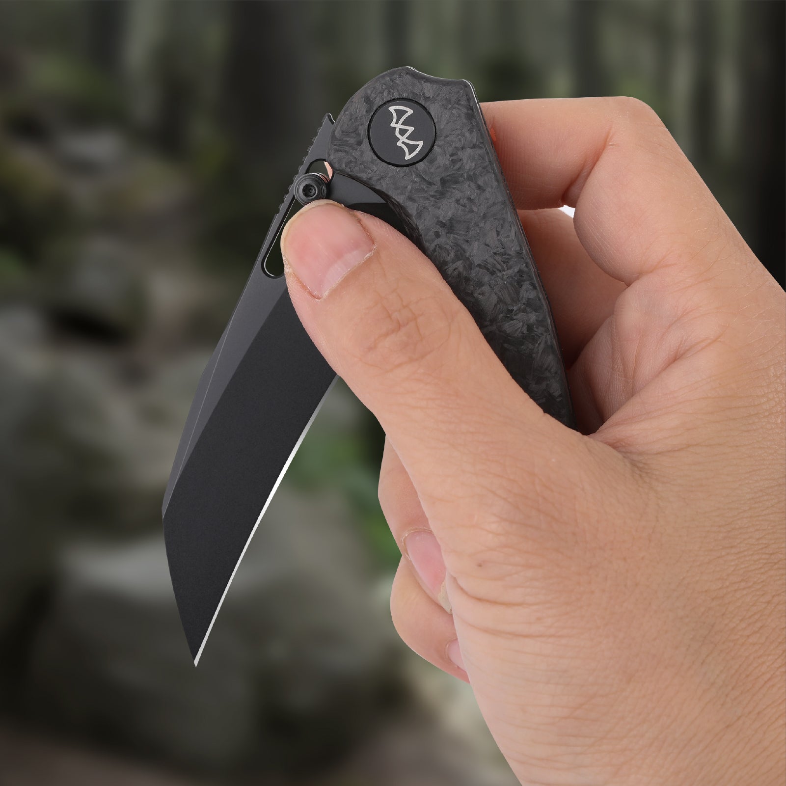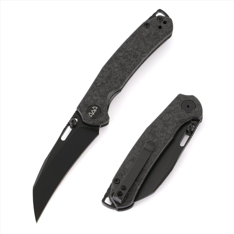 The Wixco Wortex is a compact and lightweight everyday carry folding knife featuring a 3.1″ 14C28N blade with a black finish. Built with a black shredded carbon fiber handle and liner lock mechanism with thumb stud deployment. At just 2.43oz it offers a 4″ closed length for easy pocket carry.