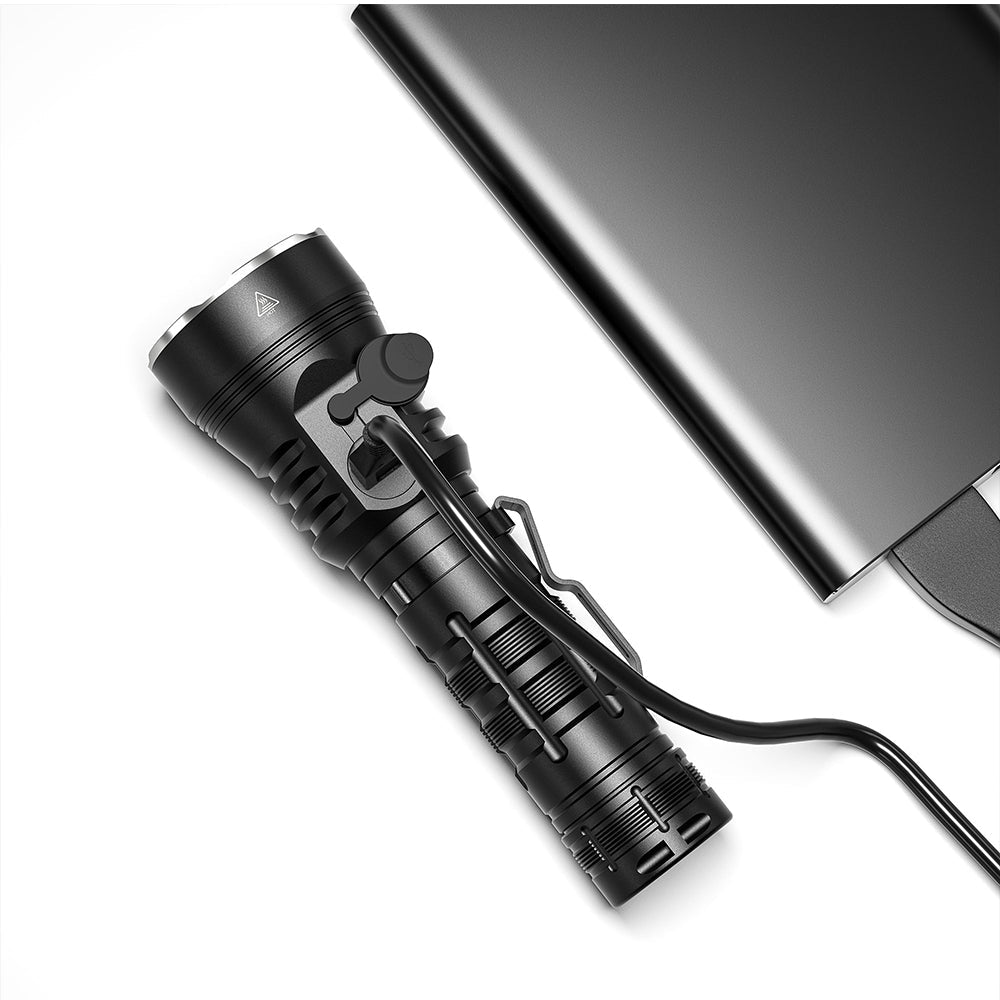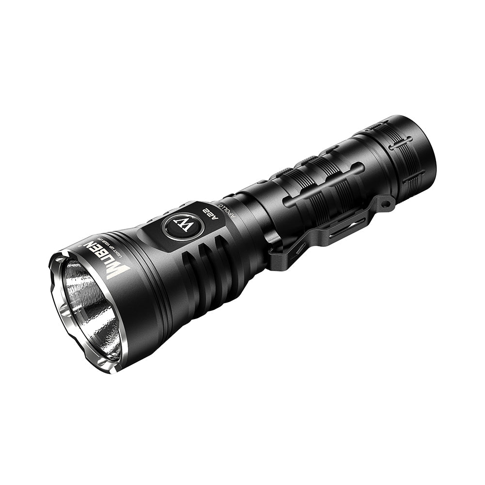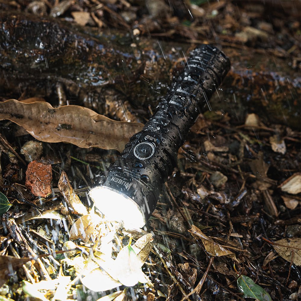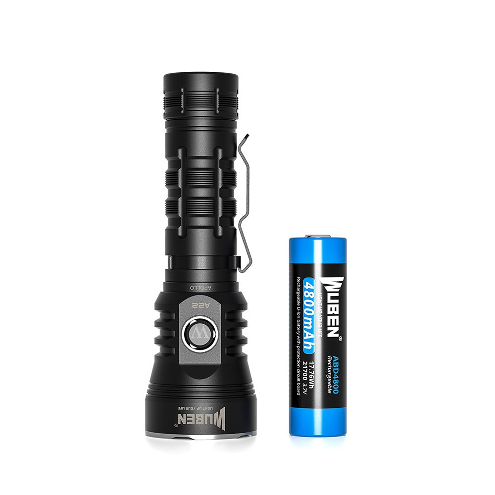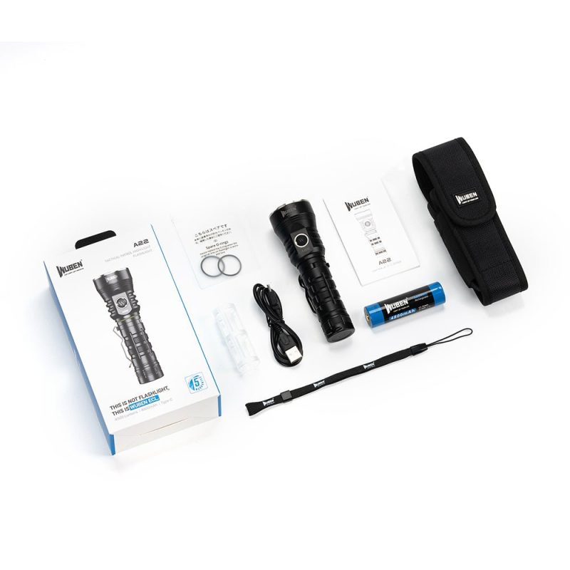 WUBEN A22 tactical flashlight with CREE XHP70.2 LED, 4500 lumens, 290m beam, 21700 battery, IP68 waterproof, Type-C charging.