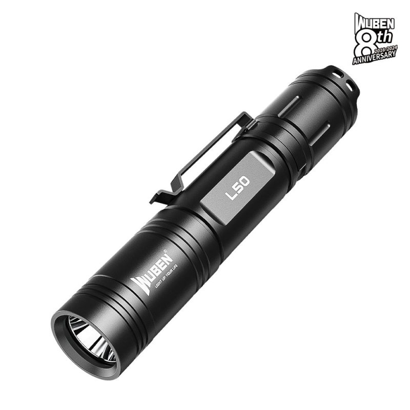 Wuben L50 is a super versatile flashlight that can do it all. It features a P9 LED paired with mirrored aluminum-plated reflector and double-sided ultra clear coating lens. The Wuben L50 is capable of producing 1200 lumens and has 5 lighting modes: High/Medium/Low/ECO/SOS. On the ECO mode, the L50 can run up to 143 hours.